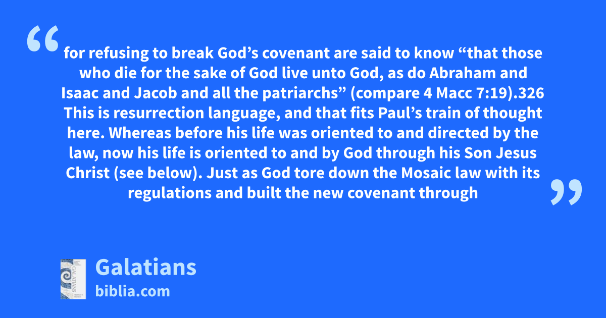 for refusing to break God’s covenant are said to know “that those who die for the sake of God live unto God, as do Abraham and Isaac and Jacob and all the patriarchs” (compare 4 Macc 7:19).326 This is resurrection language, and that fits Paul’s train of thought here. Whereas before his life was oriented to and directed by the law, now his life is oriented to and by God through his Son Jesus Christ (see below). Just as God tore down the Mosaic law with its regulations and built the new covenant through