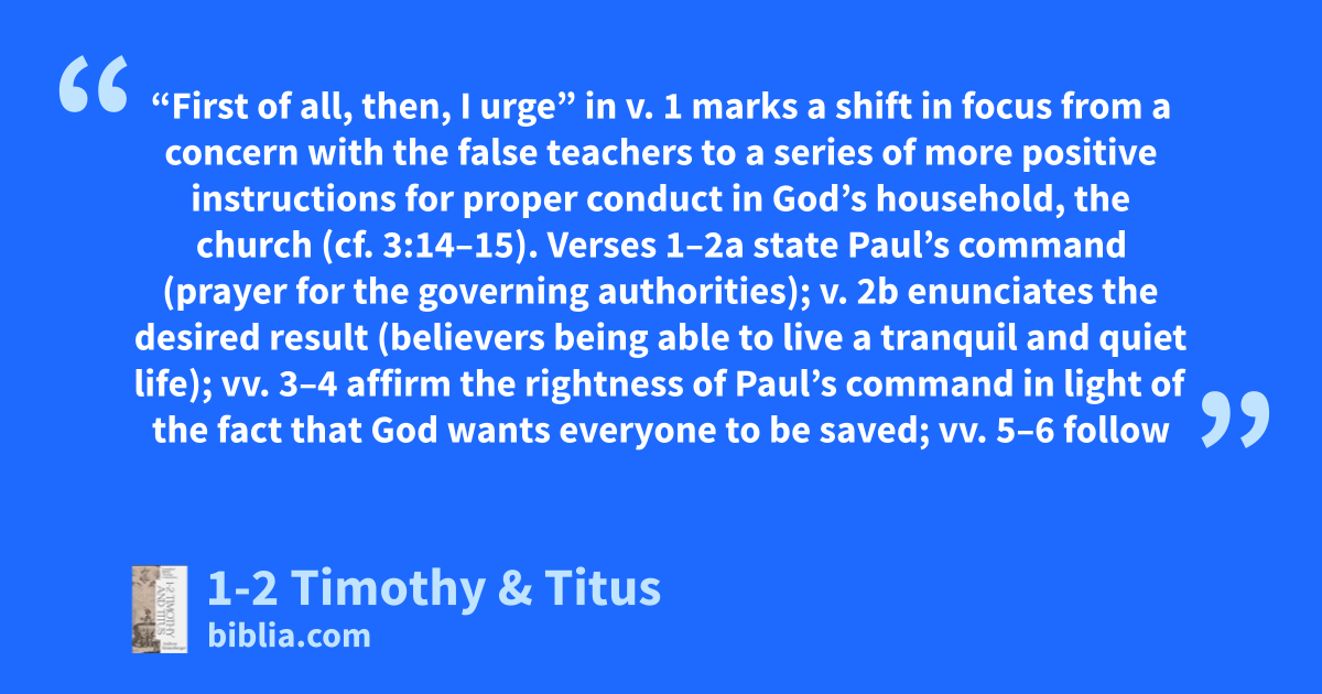 “First of all, then, I urge” in v. 1 marks a shift in focus from a concern with the false teachers to a series of more positive instructions for proper conduct in God’s household, the church (cf. 3:14–15). Verses 1–2a state Paul’s command (prayer for the governing authorities); v. 2b enunciates the desired result (believers being able to live a tranquil and quiet life); vv. 3–4 affirm the rightness of Paul’s command in light of the fact that God wants everyone to be saved; vv. 5–6 follow