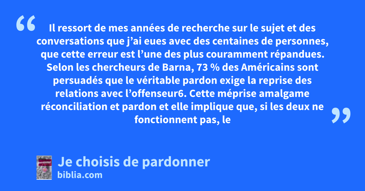 Il ressort de mes années de recherche sur le sujet et des conversations que j’ai eues avec des centaines de personnes, que cette erreur est l’une des plus couramment répandues. Selon les chercheurs de Barna, 73 % des Américains sont persuadés que le véritable pardon exige la reprise des relations avec l’offenseur6. Cette méprise amalgame réconciliation et pardon et elle implique que, si les deux ne fonctionnent pas, le
