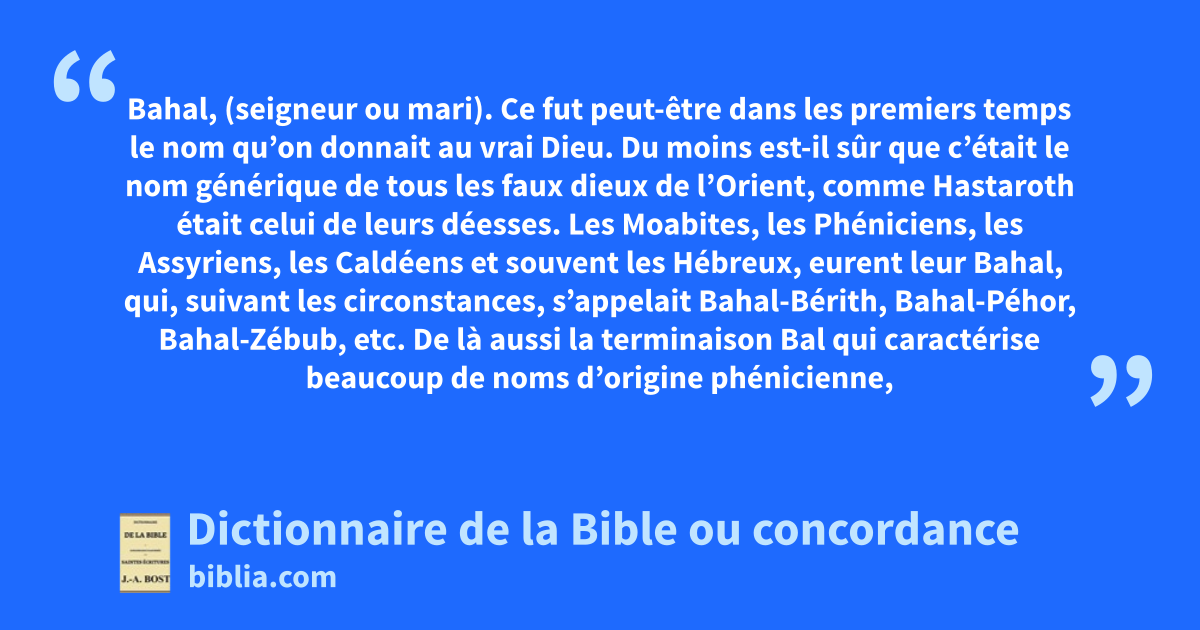 Bahal, (seigneur ou mari). Ce fut peut-être dans les premiers temps le nom qu’on donnait au vrai Dieu. Du moins est-il sûr que c’était le nom générique de tous les faux dieux de l’Orient, comme Hastaroth était celui de leurs déesses. Les Moabites, les Phéniciens, les Assyriens, les Caldéens et souvent les Hébreux, eurent leur Bahal, qui, suivant les circonstances, s’appelait Bahal-Bérith, Bahal-Péhor, Bahal-Zébub, etc. De là aussi la terminaison Bal qui caractérise beaucoup de noms d’origine phénicienne, tels que Annibal, Abibal, Asdrubal, Adherbal, etc. ; voir Eth-Bahal (1R 16.31). Ce mot de Bahal entrait souvent dans la composition des noms de personnes ou de villes, et alors les Hébreux pieux le changeaient en béseth ou boseth qui signifie honte. Ainsi de Jérubbahal ils avaient fait Jérubbéseth (Jg 6.32 ; 2S 11.21) ; d’Esbahal, Is-Boseth, et de Merib-Bahal, Méphiboseth (1Ch 8.33, 34 ; 2S 2.12 ; 9.6).