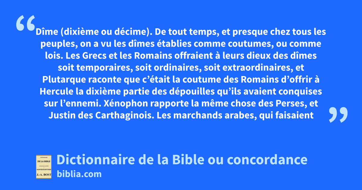 Dîme (dixième ou décime). De tout temps, et presque chez tous les peuples, on a vu les dîmes établies comme coutumes, ou comme lois. Les Grecs et les Romains offraient à leurs dieux des dîmes soit temporaires, soit ordinaires, soit extraordinaires, et Plutarque raconte que c’était la coutume des Romains d’offrir à Hercule la dixième partie des dépouilles qu’ils avaient conquises sur l’ennemi. Xénophon rapporte la même chose des Perses, et Justin des Carthaginois. Les marchands arabes, qui faisaient le commerce d’encens, n’en osaient vendre avant d’en avoir payé la dîme à leur dieu Sabis : les Scythes envoyaient des dîmes à Apollon ; les Carthaginois avaient coutume encore d’envoyer à la ville de Tyr, dont ils étaient une colonie, la dîme de tous leurs biens ; le vaisseau qui transportait ce tribut ordinaire, arriva à Tyr peu de temps avant qu’Alexandre en fit le siège. Pisistrate, écrivant à Solon pour l’engager à revenir à Athènes, lui dit que chacun y paie la dîme de ses biens pour offrir des sacrifices aux dieux. Les Pélasges qui s’étaient établis en Italie, reçurent commandement de l’oracle d’envoyer leurs dîmes à Apollon de Delphes, etc.
