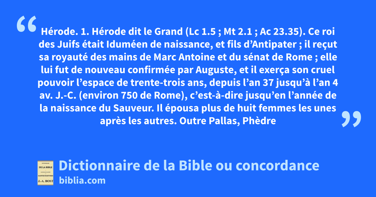 1. Hérode dit le Grand (Lc 1.5 ; Mt 2.1 ; Ac 23.35). Ce roi des Juifs était Iduméen de naissance, et fils d’Antipater ; il reçut sa royauté des mains de Marc Antoine et du sénat de Rome ; elle lui fut de nouveau confirmée par Auguste, et il exerça son cruel pouvoir l’espace de trente-trois ans, depuis l’an 37 jusqu’à l’an 4 av. J.-C. (environ 750 de Rome), c’est-à-dire jusqu’en l’année de la naissance du Sauveur. Il épousa plus de huit femmes les unes après les autres. Outre Pallas, Phèdre et Elpide, qui ne laissèrent qu’une postérité insignifiante, il faut nommer :