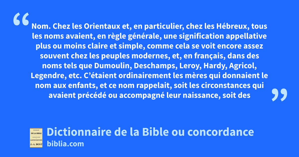 Nom. Chez les Orientaux et, en particulier, chez les Hébreux, tous les noms avaient, en règle générale, une signification appellative plus ou moins claire et simple, comme cela se voit encore assez souvent chez les peuples modernes, et, en français, dans des noms tels que Dumoulin, Deschamps, Leroy, Hardy, Agricol, Legendre, etc. C’étaient ordinairement les mères qui donnaient le nom aux enfants, et ce nom rappelait, soit les circonstances qui avaient précédé ou accompagné leur naissance, soit des préoccupations, des craintes ou des désirs, des souvenirs ou des vœux. Ils faisaient ainsi connaître, tantôt un détail de l’histoire de l’enfant, tantôt les pressentiments de la mère ; on peut voir ce que dit l’Écriture au sujet des noms d’Ève, de Caïn, d’Abel, de Noé, etc. (Gn 3.20 ; 4.1 ; 5.29 ; 29.32, etc.).