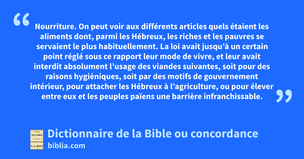 Nourriture. On peut voir aux différents articles quels étaient les aliments dont, parmi les Hébreux, les riches et les pauvres se servaient le plus habituellement. La loi avait jusqu’à un certain point réglé sous ce rapport leur mode de vivre, et leur avait interdit absolument l’usage des viandes suivantes, soit pour des raisons hygiéniques, soit par des motifs de gouvernement intérieur, pour attacher les Hébreux à l’agriculture, ou pour élever entre eux et les peuples païens une barrière infranchissable.