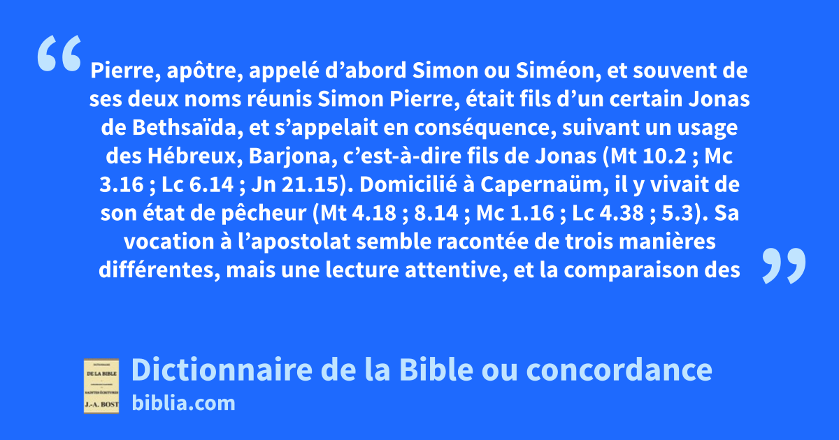 Pierre, apôtre, appelé d’abord Simon ou Siméon, et souvent de ses deux noms réunis Simon Pierre, était fils d’un certain Jonas de Bethsaïda, et s’appelait en conséquence, suivant un usage des Hébreux, Barjona, c’est-à-dire fils de Jonas (Mt 10.2 ; Mc 3.16 ; Lc 6.14 ; Jn 21.15). Domicilié à Capernaüm, il y vivait de son état de pêcheur (Mt 4.18 ; 8.14 ; Mc 1.16 ; Lc 4.38 ; 5.3). Sa vocation à l’apostolat semble racontée de trois manières différentes, mais une lecture attentive, et la comparaison des passages montre d’abord qu’il y a eu double vocation, puis, qu’entre les deux autres versions l’une est plus complète, que l’autre, mais non contradictoire ou différente. On voit d’abord (Jn 1.40 et suivants), que Pierre, disciple de Jean-Baptiste, fut instruit de bonne heure par André son frère, de la venue et de l’œuvre du Messie : Jésus pénétra le futur apôtre, et lui prédit les destinées auxquelles il était réservé ; toutefois, il ne l’appela point encore à le suivre, comme il en avait appelé d’autres. Un second récit, celui de la vocation proprement dite de Pierre, se lit (Mt 4.18 ; Mc 1.16) ; mais il est abrégé, saint Luc (Lc 5.1 et suivants) le développe et l’étend ; c’est dans sa narration qu’on a voulu trouver une troisième version d’un même fait (Winer).