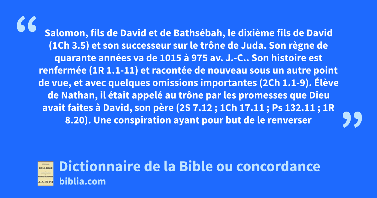Salomon, fils de David et de Bathsébah, le dixième fils de David (1Ch 3.5) et son successeur sur le trône de Juda. Son règne de quarante années va de 1015 à 975 av. J.-C.. Son histoire est renfermée (1R 1.1-11) et racontée de nouveau sous un autre point de vue, et avec quelques omissions importantes (2Ch 1.1-9). Élève de Nathan, il était appelé au trône par les promesses que Dieu avait faites à David, son père (2S 7.12 ; 1Ch 17.11 ; Ps 132.11 ; 1R 8.20). Une conspiration ayant pour but de le renverser hâta son couronnement. Il fut présenté au peuple par Nathan, Tsadoc et Bénaja, reçut avec modestie les applaudissements de la multitude, déjoua, par son élévation, le complot qui devait lui ravir la couronne avant qu’elle fût posée sur sa tête, et pardonna à son imprudent et malheureux frère Adonija, n’exigeant de lui qu’un avenir de fidélité pour expiation d’une révolte passée. On suppose que c’est à l’âge d’environ vingt ans qu’il monta sur le trône ; Josèphe ne lui donne que quatorze ans, d’autres encore moins, à cette époque de sa vie.
