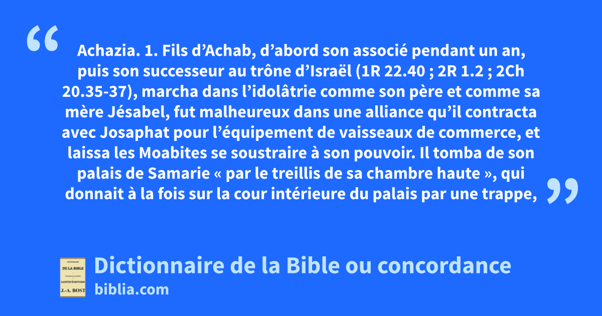 1. Fils d’Achab, d’abord son associé pendant un an, puis son successeur au trône d’Israël (1R 22.40 ; 2R 1.2 ; 2Ch 20.35-37), marcha dans l’idolâtrie comme son père et comme sa mère Jésabel, fut malheureux dans une alliance qu’il contracta avec Josaphat pour l’équipement de vaisseaux de commerce, et laissa les Moabites se soustraire à son pouvoir. Il tomba de son palais de Samarie « par le treillis de sa chambre haute », qui donnait à la fois sur la cour intérieure du palais par une trappe, et sur la rue ou sur les parvis extérieurs par la balustrade dont le toit était environné, voir Maison ; comme il était fort malade de sa chute, il envoya consulter Bahal-Zébub, dieu de Hébron ; ses serviteurs ne purent remplir leur message et revinrent annoncer à leur maître qu’un prophète les ayant rencontrés leur avait annoncé la mort prochaine et sûre d’Achazia. Le roi, sur la description qui lui en fut faite, reconnut le prophète Élie, et, pensant tuer la prophétie en tuant le prophète, il envoya l’une après l’autre deux compagnies de cinquante hommes au Carmel pour le saisir. Une troisième troupe fut encore envoyée, dont le chef (voir Abdias), au lieu de prendre le ton impérieux qui avait attiré le feu du ciel sur les deux premiers, s’agenouilla devant le prophète et le supplia de le suivre auprès du roi. Élie descendit, alla vers le roi et lui répéta ce qu’il avait déjà dit à ses serviteurs : « Tu ne descendras pas du lit sur lequel tu es monté, mais certainement tu mourras ». Il mourut en effet, suivant la parole du Seigneur, et sans postérité, un an après la mort de son père, 896 av. J.-C. ; Joram, son frère, lui succéda.