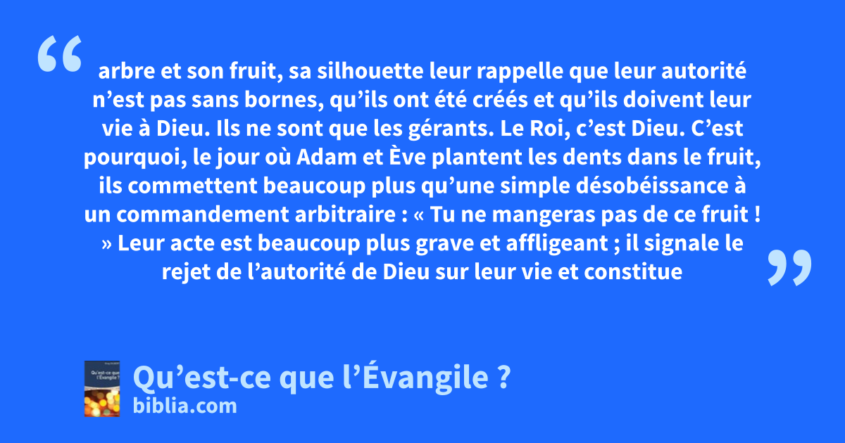 arbre et son fruit, sa silhouette leur rappelle que leur autorité n’est pas sans bornes, qu’ils ont été créés et qu’ils doivent leur vie à Dieu. Ils ne sont que les gérants. Le Roi, c’est Dieu. C’est pourquoi, le jour où Adam et Ève plantent les dents dans le fruit, ils commettent beaucoup plus qu’une simple désobéissance à un commandement arbitraire : « Tu ne mangeras pas de ce fruit ! » Leur acte est beaucoup plus grave et affligeant ; il signale le rejet de l’autorité de Dieu sur leur vie et constitue