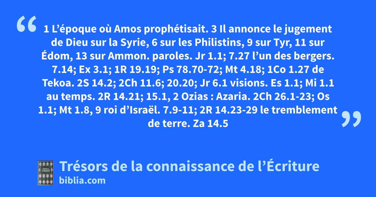 paroles. Jr 1.1; 7.27 l’un des bergers. 7.14; Ex 3.1; 1R 19.19; Ps 78.70-72; Mt 4.18; 1Co 1.27 de Tekoa. 2S 14.2; 2Ch 11.6; 20.20; Jr 6.1 visions. Es 1.1; Mi 1.1 au temps. 2R 14.21; 15.1, 2 Ozias : Azaria. 2Ch 26.1-23; Os 1.1; Mt 1.8, 9 roi d’Israël. 7.9-11; 2R 14.23-29 le tremblement de terre. Za 14.5