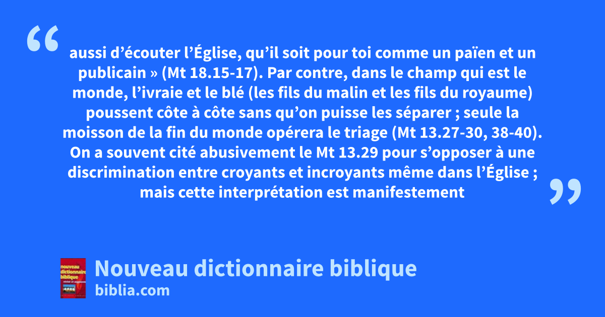 aussi d’écouter l’Église, qu’il soit pour toi comme un païen et un publicain » (Mt 18.15-17). Par contre, dans le champ qui est le monde, l’ivraie et le blé (les fils du malin et les fils du royaume) poussent côte à côte sans qu’on puisse les séparer ; seule la moisson de la fin du monde opérera le triage (Mt 13.27-30, 38-40). On a souvent cité abusivement le Mt 13.29 pour s’opposer à une discrimination entre croyants et incroyants même dans l’Église ; mais cette interprétation est manifestement