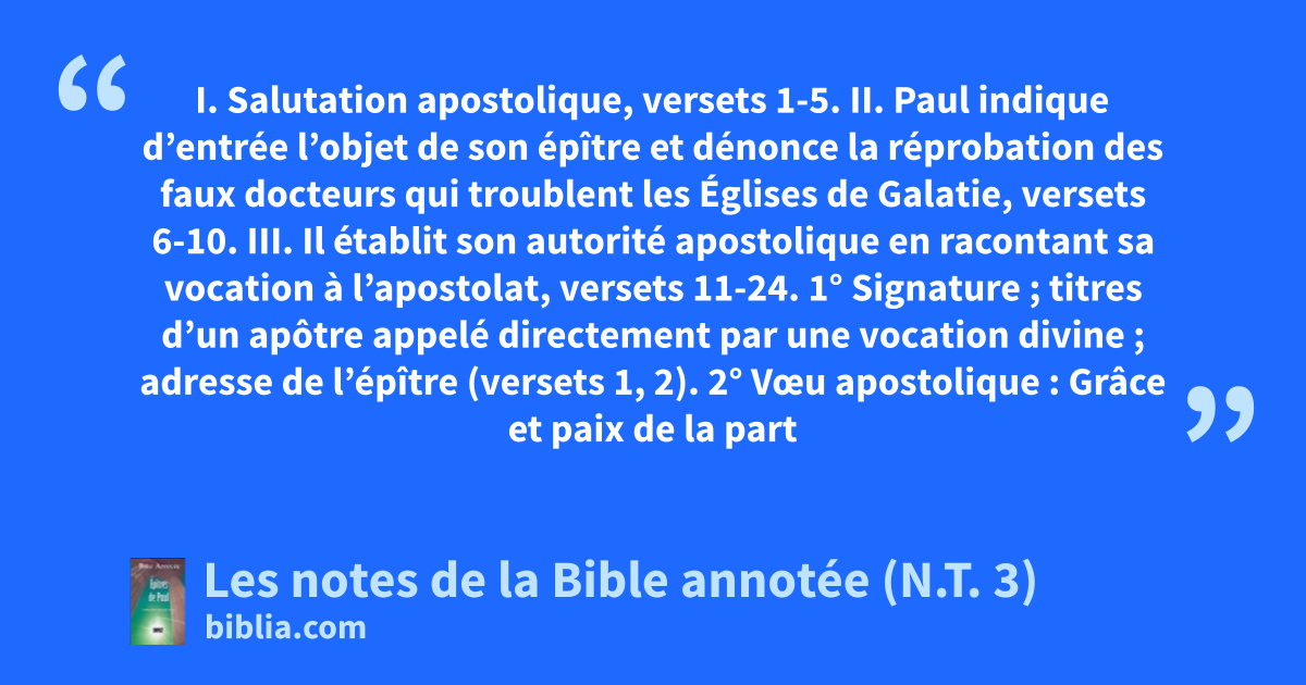 I. Salutation apostolique, versets 1-5. II. Paul indique d’entrée l’objet de son épître et dénonce la réprobation des faux docteurs qui troublent les Églises de Galatie, versets 6-10. III. Il établit son autorité apostolique en racontant sa vocation à l’apostolat, versets 11-24. 1° Signature ; titres d’un apôtre appelé directement par une vocation divine ; adresse de l’épître (versets 1, 2). 2° Vœu apostolique : Grâce et paix de la part