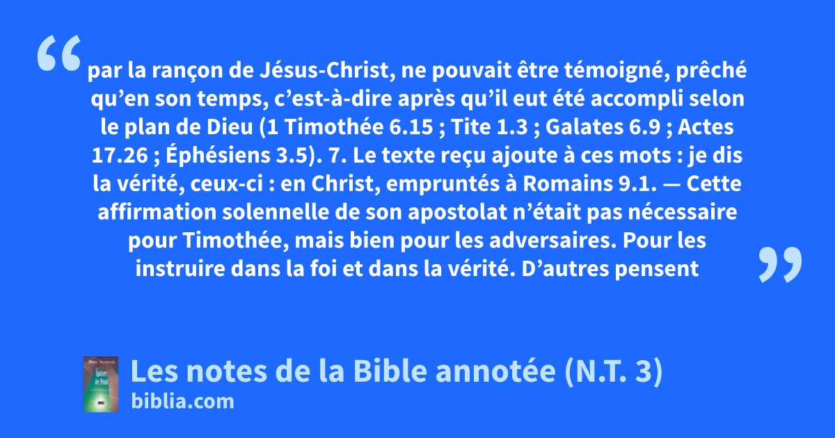 par la rançon de Jésus-Christ, ne pouvait être témoigné, prêché qu’en son temps, c’est-à-dire après qu’il eut été accompli selon le plan de Dieu (1 Timothée 6.15 ; Tite 1.3 ; Galates 6.9 ; Actes 17.26 ; Éphésiens 3.5). 7. Le texte reçu ajoute à ces mots : je dis la vérité, ceux-ci : en Christ, empruntés à Romains 9.1. — Cette affirmation solennelle de son apostolat n’était pas nécessaire pour Timothée, mais bien pour les adversaires. Pour les instruire dans la foi et dans la vérité. D’autres pensent