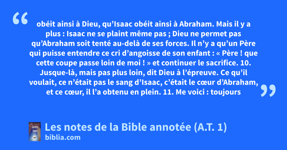 obéit ainsi à Dieu, qu’Isaac obéit ainsi à Abraham. Mais il y a plus : Isaac ne se plaint même pas ; Dieu ne permet pas qu’Abraham soit tenté au-delà de ses forces. Il n’y a qu’un Père qui puisse entendre ce cri d’angoisse de son enfant : « Père ! que cette coupe passe loin de moi ! » et continuer le sacrifice. 10. Jusque-là, mais pas plus loin, dit Dieu à l’épreuve. Ce qu’il voulait, ce n’était pas le sang d’Isaac, c’était le cœur d’Abraham, et ce cœur, il l’a obtenu en plein. 11. Me voici : toujours