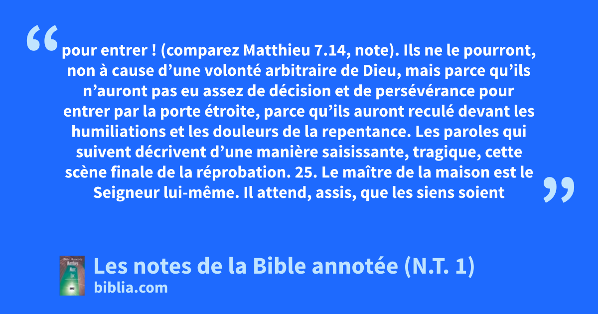 pour entrer ! (comparez Matthieu 7.14, note). Ils ne le pourront, non à cause d’une volonté arbitraire de Dieu, mais parce qu’ils n’auront pas eu assez de décision et de persévérance pour entrer par la porte étroite, parce qu’ils auront reculé devant les humiliations et les douleurs de la repentance. Les paroles qui suivent décrivent d’une manière saisissante, tragique, cette scène finale de la réprobation. 25. Le maître de la maison est le Seigneur lui-même. Il attend, assis, que les siens soient