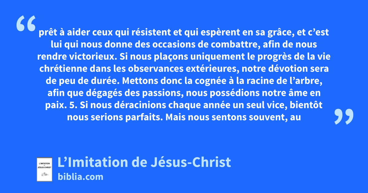 prêt à aider ceux qui résistent et qui espèrent en sa grâce, et c’est lui qui nous donne des occasions de combattre, afin de nous rendre victorieux. Si nous plaçons uniquement le progrès de la vie chrétienne dans les observances extérieures, notre dévotion sera de peu de durée. Mettons donc la cognée à la racine de l’arbre, afin que dégagés des passions, nous possédions notre âme en paix. 5. Si nous déracinions chaque année un seul vice, bientôt nous serions parfaits. Mais nous sentons souvent, au