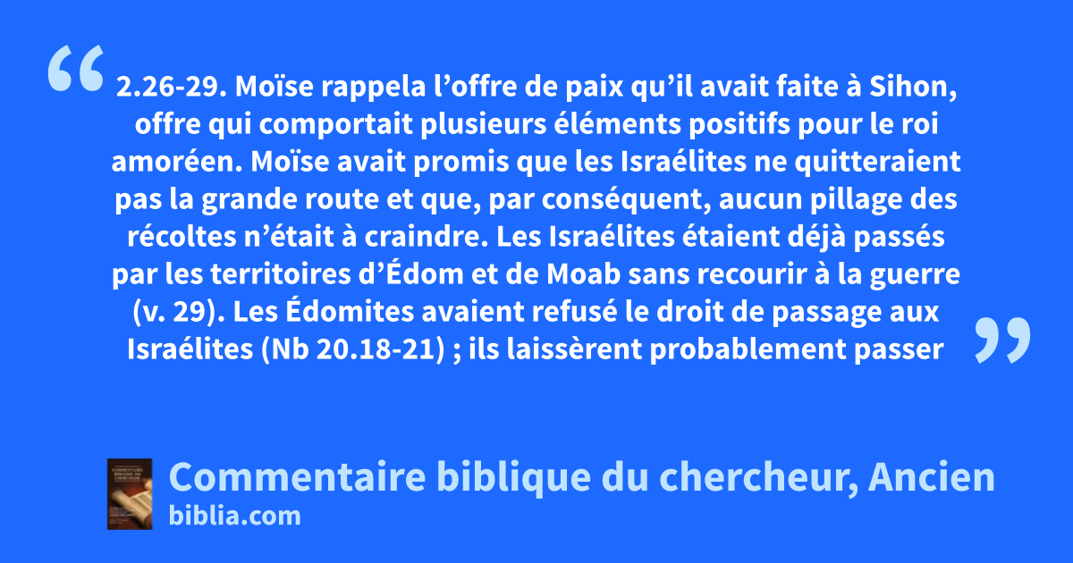 2.26-29. Moïse rappela l’offre de paix qu’il avait faite à Sihon, offre qui comportait plusieurs éléments positifs pour le roi amoréen. Moïse avait promis que les Israélites ne quitteraient pas la grande route et que, par conséquent, aucun pillage des récoltes n’était à craindre. Les Israélites étaient déjà passés par les territoires d’Édom et de Moab sans recourir à la guerre (v. 29). Les Édomites avaient refusé le droit de passage aux Israélites (Nb 20.18-21) ; ils laissèrent probablement passer