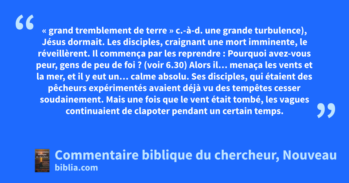 « grand tremblement de terre » c.-à-d. une grande turbulence), Jésus dormait. Les disciples, craignant une mort imminente, le réveillèrent. Il commença par les reprendre : Pourquoi avez-vous peur, gens de peu de foi ? (voir 6.30) Alors il… menaça les vents et la mer, et il y eut un… calme absolu. Ses disciples, qui étaient des pêcheurs expérimentés avaient déjà vu des tempêtes cesser soudainement. Mais une fois que le vent était tombé, les vagues continuaient de clapoter pendant un certain temps.