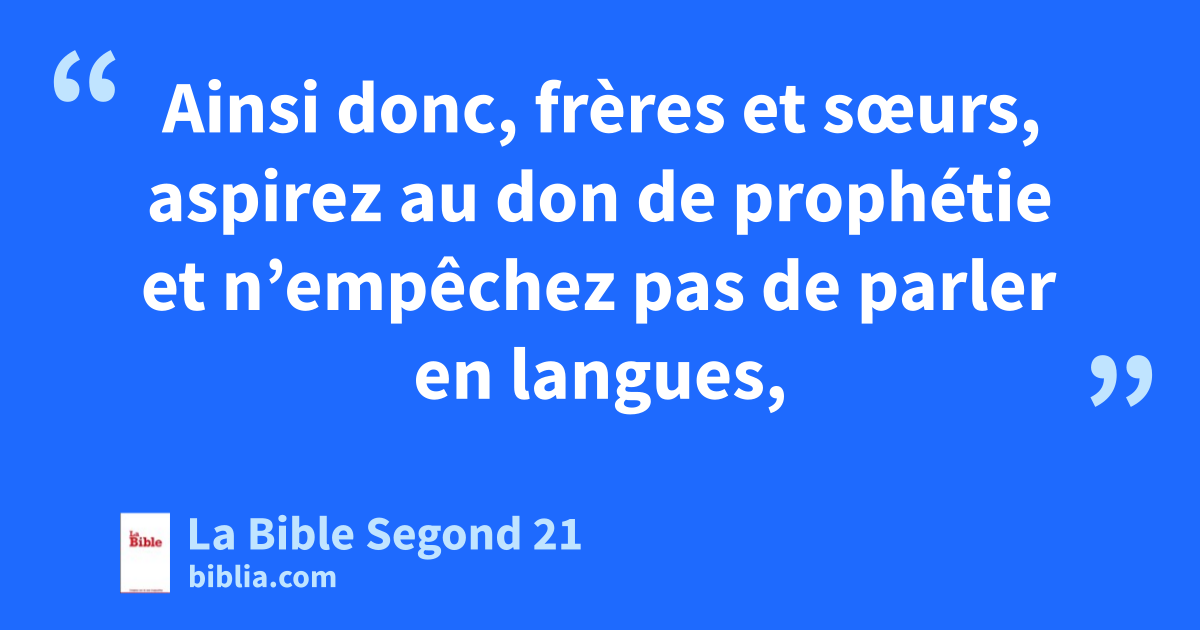 39Ainsi donc, frères et sœurs, aspirez au don de prophétie et n’empêchez pas de parler en langues, 40mais que tout se fasse convenablement et avec ordre.