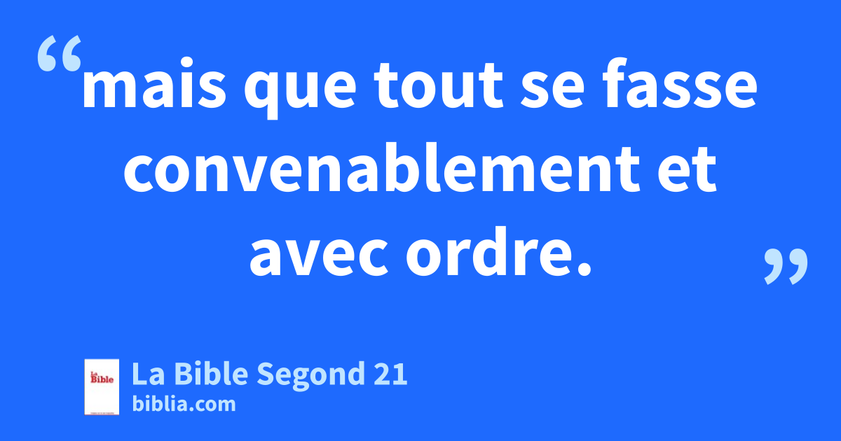 39Ainsi donc, frères et sœurs, aspirez au don de prophétie et n’empêchez pas de parler en langues, 40mais que tout se fasse convenablement et avec ordre.