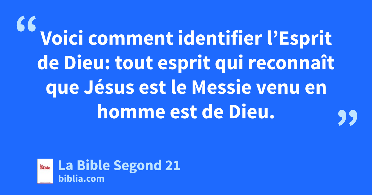 4 Bien-aimés, ne vous fiez pas à tout esprit mais mettez les esprits à l’épreuve pour savoir s’ils sont de Dieu, car plusieurs prétendus prophètes sont venus dans le monde. 2Voici comment identifier l’Esprit de Dieu: tout esprit qui reconnaît que Jésus est le Messie venu en homme est de Dieu. 3Et si un esprit ne reconnaît pas que Jésus est le Messie venu en homme, il n’est pas de Dieu: c’est l’esprit de l’Antichrist. Vous avez appris sa venue, et maintenant déjà il est dans le monde.