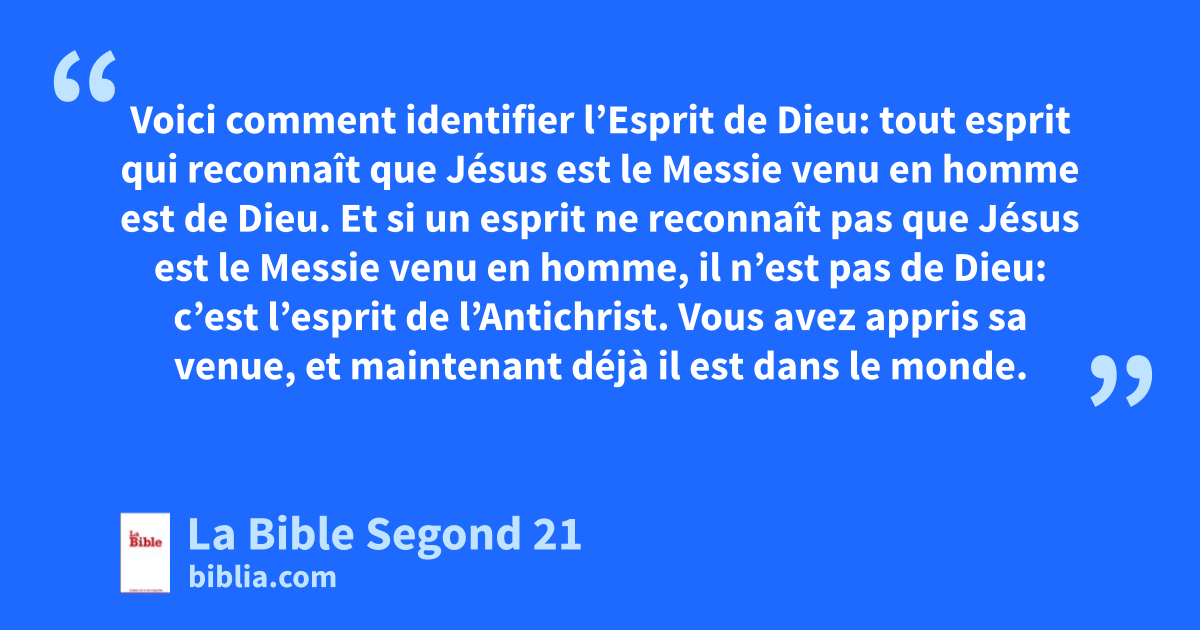 4 Bien-aimés, ne vous fiez pas à tout esprit mais mettez les esprits à l’épreuve pour savoir s’ils sont de Dieu, car plusieurs prétendus prophètes sont venus dans le monde. 2Voici comment identifier l’Esprit de Dieu: tout esprit qui reconnaît que Jésus est le Messie venu en homme est de Dieu. 3Et si un esprit ne reconnaît pas que Jésus est le Messie venu en homme, il n’est pas de Dieu: c’est l’esprit de l’Antichrist. Vous avez appris sa venue, et maintenant déjà il est dans le monde.