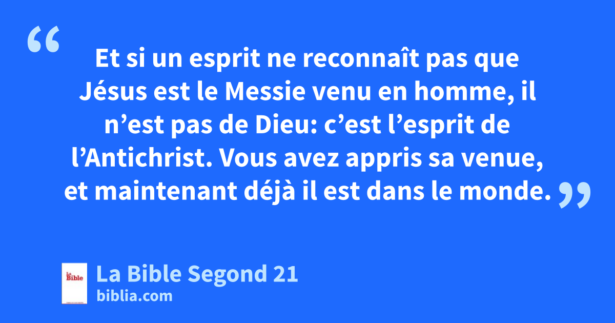 4 Bien-aimés, ne vous fiez pas à tout esprit mais mettez les esprits à l’épreuve pour savoir s’ils sont de Dieu, car plusieurs prétendus prophètes sont venus dans le monde. 2Voici comment identifier l’Esprit de Dieu: tout esprit qui reconnaît que Jésus est le Messie venu en homme est de Dieu. 3Et si un esprit ne reconnaît pas que Jésus est le Messie venu en homme, il n’est pas de Dieu: c’est l’esprit de l’Antichrist. Vous avez appris sa venue, et maintenant déjà il est dans le monde.