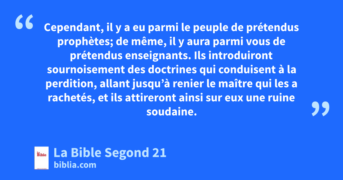 2 Cependant, il y a eu parmi le peuple de prétendus prophètes; de même, il y aura parmi vous de prétendus enseignants. Ils introduiront sournoisement des doctrines qui conduisent à la perdition, allant jusqu’à renier le maître qui les a rachetés, et ils attireront ainsi sur eux une ruine soudaine. 2Beaucoup les suivront dans leur immoralité, et la voie de la vérité sera calomniée à cause d’eux. 3Dans leur soif de posséder, ils vous exploiteront avec des paroles trompeuses, mais leur condamnation menace depuis longtemps et leur ruine ne tardera pas.