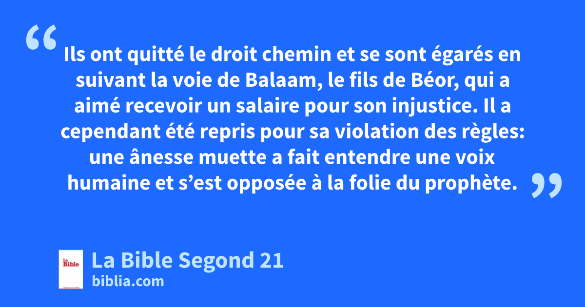 9Ainsi donc, le Seigneur sait délivrer de l’épreuve les hommes pieux et garder les injustes pour le jour du jugement où ils seront punis. 10C’est le cas notamment de ceux qui, dans un désir d’impureté, courent après les plaisirs de la chair et méprisent toute autorité. Présomptueux et arrogants, ils ne craignent pas d’insulter les êtres glorieux, 11alors que les anges, pourtant supérieurs en force et en puissance, ne portent pas de jugement insultant contre eux devant le Seigneur. 12Mais eux, pareils à des animaux dépourvus de raison qui sont destinés à être capturés et abattus, ils calomnient ce qu’ils ignorent; ils mourront aussi comme des bêtes 13et recevront alors le salaire de leur injustice, eux qui trouvent leur plaisir à se livrer à la débauche en plein jour. Hommes pervers et souillés, ils se délectent de leurs tromperies quand ils prennent part à vos festins. 14Les yeux pleins d’adultère et jamais rassasiés de péchés, ils prennent au piège les personnes mal affermies; ils ont le cœur entraîné par l’exercice à la soif de posséder, et ce sont des enfants de malédiction. 15Ils ont quitté le droit chemin et se sont égarés en suivant la voie de Balaam, le fils de Béor, qui a aimé recevoir un salaire pour son injustice. 16Il a cependant été repris pour sa violation des règles: une ânesse muette a fait entendre une voix humaine et s’est opposée à la folie du prophète.
