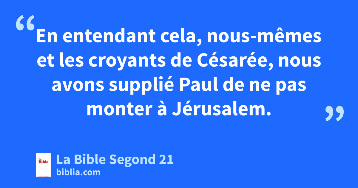8Nous sommes repartis le lendemain pour Césarée. Là, nous sommes entrés chez Philippe l’évangéliste, qui était l’un des septc, et nous avons logé chez lui. 9Il avait quatre filles vierges qui prophétisaient. 10Nous étions là depuis plusieurs jours lorsqu’un prophète du nom d’Agabus est descendu de Judée 11et est venu nous trouver. Il a pris la ceinture de Paul, s’est attaché les pieds et les mains et a dit: «Voici ce que déclare le Saint-Esprit: ‘L’homme à qui appartient cette ceinture, les Juifs l’attacheront de la même manière à Jérusalem et le livreront entre les mains des non-Juifs.’» 12En entendant cela, nous-mêmes et les croyants de Césarée, nous avons supplié Paul de ne pas monter à Jérusalem. 13Il a alors répondu: «Que faites-vous là à pleurer et à me briser le cœur? Je suis prêt non seulement à être emprisonné, mais encore à mourir à Jérusalem pour le nom du Seigneur Jésus.» 14Comme il ne se laissait pas persuader, nous n’avons pas insisté et avons dit: «Que la volonté du Seigneur soit faite!»