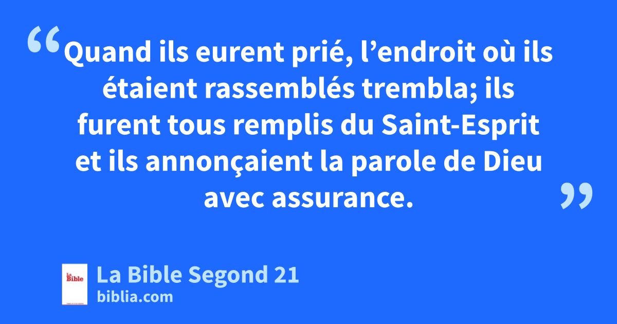 31Quand ils eurent prié, l’endroit où ils étaient rassemblés trembla; ils furent tous remplis du Saint-Esprit et ils annonçaient la parole de Dieu avec assurance.