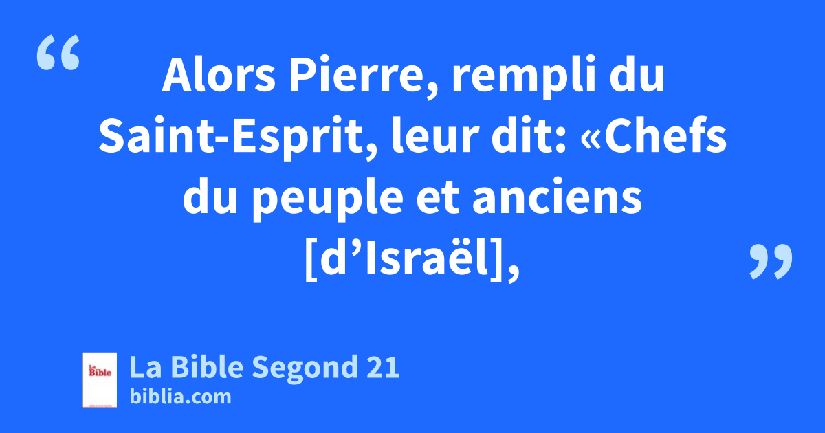 8Alors Pierre, rempli du Saint-Esprit, leur dit: «Chefs du peuple et anciens [d’Israël], 9on nous interroge aujourd’hui sur un bienfait accordé à un infirme, afin que nous disions comment il a été guéri. 10Sachez-le bien, vous tous, et que tout le peuple d’Israël le sache: c’est par le nom de Jésus-Christ de Nazareth, celui que vous avez crucifié et que Dieu a ressuscité, oui, c’est par lui que cet homme se présente en pleine santé devant vous. 11Jésus est la pierre rejetée par vous qui construisez et qui est devenue la pierre angulaire.n 12Il n’y a de salut en aucun autre, car il n’y a sous le ciel aucun autre nom qui ait été donné parmi les hommes, par lequel nous devions être sauvés.»