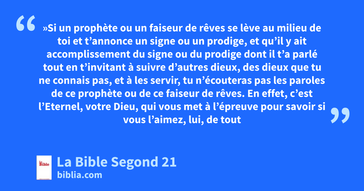 2»Si un prophète ou un faiseur de rêves se lève au milieu de toi et t’annonce un signe ou un prodige, 3et qu’il y ait accomplissement du signe ou du prodige dont il t’a parlé tout en t’invitant à suivre d’autres dieux, des dieux que tu ne connais pas, et à les servir, 4tu n’écouteras pas les paroles de ce prophète ou de ce faiseur de rêves. En effet, c’est l’Eternel, votre Dieu, qui vous met à l’épreuve pour savoir si vous l’aimez, lui, de tout votre cœur et toute votre âme. 5C’est l’Eternel, votre Dieu, que vous suivrez et c’est lui que vous craindrez. Ce sont ses commandements que vous respecterez, c’est à lui que vous obéirez, c’est lui que vous servirez et c’est à lui que vous vous attacherez. 6Ce prophète ou ce faiseur de rêves sera puni de mort, car il a parlé de révolte contre l’Eternel, votre Dieu, qui vous a fait sortir d’Egypte et vous a délivrés de la maison d’esclavage, et il a voulu te détourner de la voie dans laquelle l’Eternel, ton Dieu, t’a ordonné de marcher. Tu extirperas ainsi le mal du milieu de toi.q