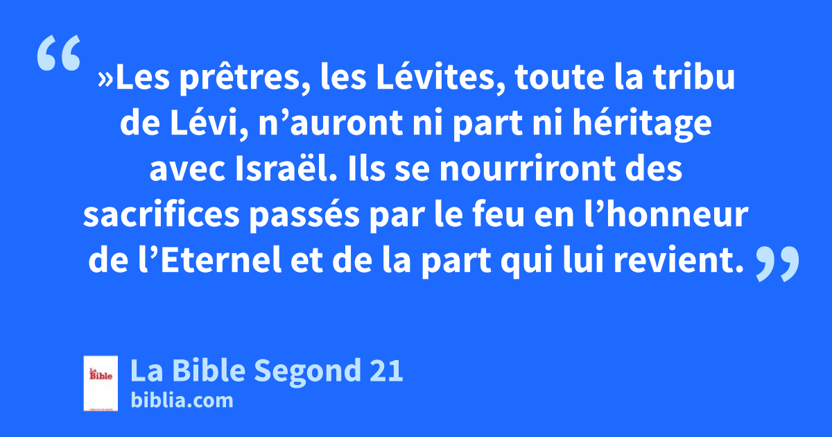 18 »Les prêtres, les Lévites, toute la tribu de Lévi, n’auront ni part ni héritage avec Israël. Ils se nourriront des sacrifices passés par le feu en l’honneur de l’Eternel et de la part qui lui revient. 2Ils n’auront pas d’héritage au milieu de leurs frères. C’est l’Eternel qui sera leur héritage, comme il le leur a dit. 3Voici la part à laquelle les prêtres auront droit sur le peuple, sur ceux qui offriront un sacrifice, un bœuf ou un agneau: on donnera au prêtre la cuisse, les mâchoires et l’estomac. 4Tu lui donneras la première partie de ton blé, de ton vin nouveau et de ton huile, ainsi que de la toison de tes brebis. 5En effet, c’est lui que l’Eternel, ton Dieu, a choisi entre toutes tes tribus pour faire toujours le service au nom de l’Eternel, lui et ses descendants.