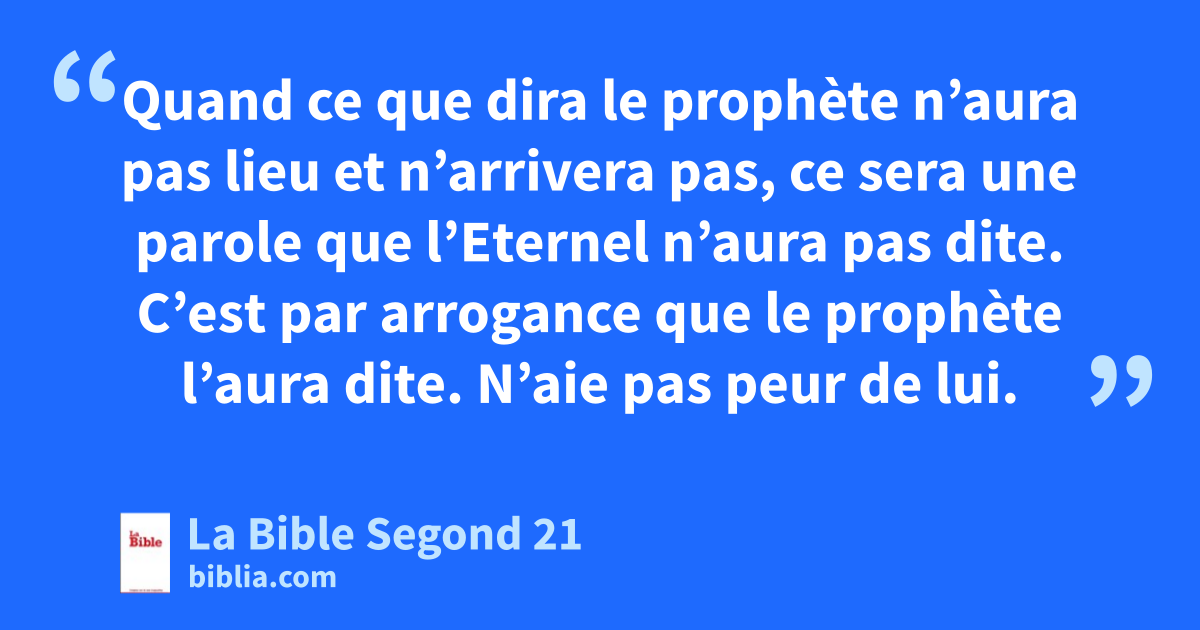 15»L’Eternel, ton Dieu, fera surgir pour toi et du milieu de toi, parmi tes frères, un prophète comme moi: c’est lui que vous devrez écouter.t 16Il répondra ainsi à la demande que tu as faite à l’Eternel, ton Dieu, à Horeb, le jour de l’assemblée. Tu disais: ‘Je ne veux plus entendre la voix de l’Eternel, mon Dieu, ni voir ce grand feu, afin de ne pas mourir.’ 17L’Eternel m’a dit: ‘Ce qu’ils ont dit est bien. 18Je ferai surgir pour eux, du milieu de leurs frères, un prophète comme toi. Je mettrai mes paroles dans sa bouche et il leur dira tout ce que je lui ordonnerai. 19Si quelqu’un n’écoute pas mes paroles, celles qu’il dira en mon nom, c’est moi qui lui en demanderai compte.u 20Mais si un prophète a l’arrogance de dire en mon nom une parole que je ne lui ai pas ordonné de dire ou parle au nom d’autres dieux, il sera puni de mort.’ 21Peut-être diras-tu dans ton cœur: ‘Comment reconnaîtrons-nous la parole que l’Eternel n’aura pas dite?’ 22Quand ce que dira le prophète n’aura pas lieu et n’arrivera pas, ce sera une parole que l’Eternel n’aura pas dite. C’est par arrogance que le prophète l’aura dite. N’aie pas peur de lui.