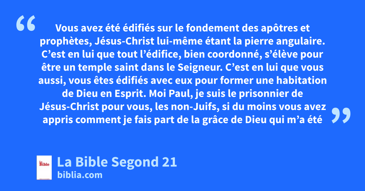 19Ainsi donc, vous n’êtes plus des étrangers ni des résidents temporaires; vous êtes au contraire concitoyens des saints, membres de la famille de Dieu. 20Vous avez été édifiés sur le fondement des apôtres et prophètes, Jésus-Christ lui-même étant la pierre angulaire. 21C’est en lui que tout l’édifice, bien coordonné, s’élève pour être un temple saint dans le Seigneur. 22C’est en lui que vous aussi, vous êtes édifiés avec eux pour former une habitation de Dieu en Esprit.