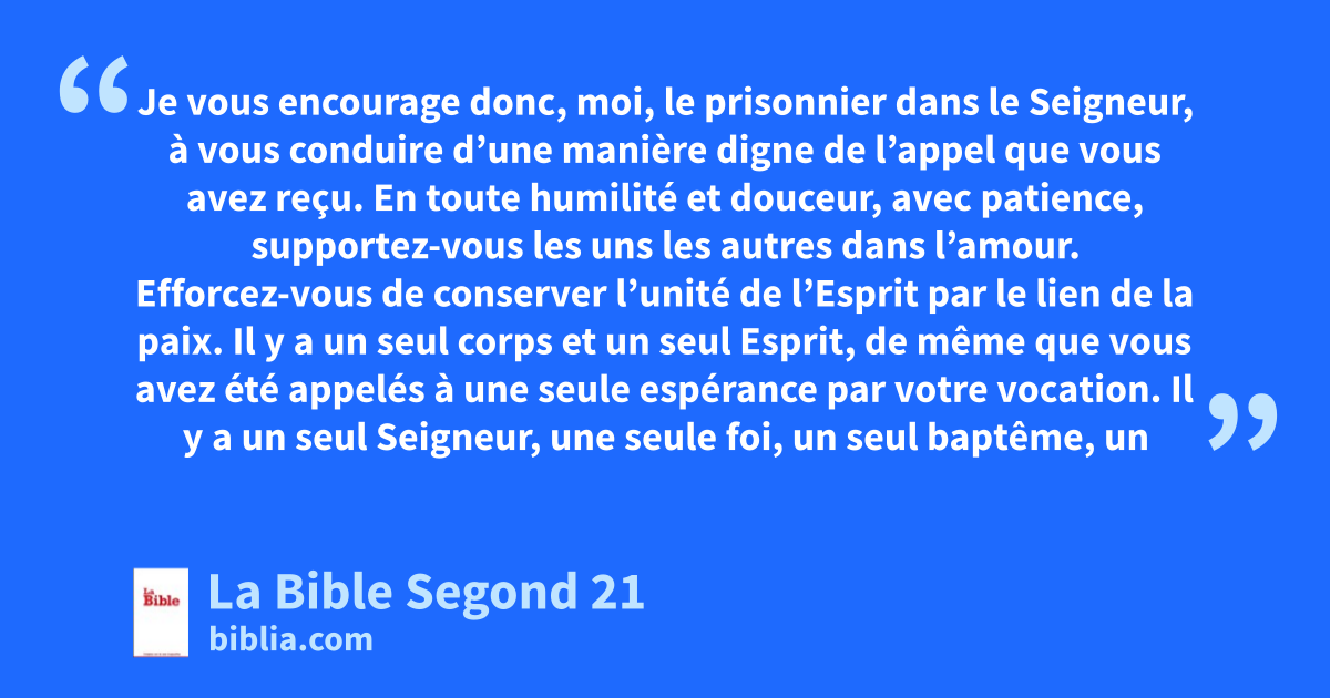 4 Je vous encourage donc, moi, le prisonnier dans le Seigneur, à vous conduire d’une manière digne de l’appel que vous avez reçu. 2En toute humilité et douceur, avec patience, supportez-vous les uns les autres dans l’amour. 3Efforcez-vous de conserver l’unité de l’Esprit par le lien de la paix. 4Il y a un seul corps et un seul Esprit, de même que vous avez été appelés à une seule espérance par votre vocation. 5Il y a un seul Seigneur, une seule foi, un seul baptême, 6un seul Dieu et Père de tous. Il est au-dessus de tous, agit à travers tous et habite en [nous] tous.