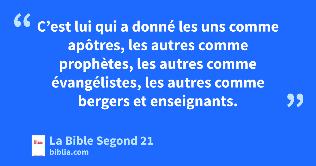 7Cependant, à chacun de nous la grâce a été donnée à la mesure du don de Christ. 8C’est pourquoi il est dit: Il est monté sur les hauteurs, il a emmené des prisonniers et il a fait des dons aux hommes.h 9Or, que signifie: Il est monté, sinon qu’il est aussi [d’abord] descendu dans les régions les plus basses de la terre? 10Celui qui est descendu, c’est celui qui est monté au-dessus de tous les cieux afin de remplir tout l’univers. 11C’est lui qui a donné les uns comme apôtres, les autres comme prophètes, les autres comme évangélistes, les autres comme bergers et enseignants. 12Il l’a fait pour former les saints aux tâches du service en vue de l’édification du corps de Christ, 13jusqu’à ce que nous parvenions tous à l’unité de la foi et de la connaissance du Fils de Dieu, à la maturité de l’adulte, à la mesure de la stature parfaite de Christ. 14Ainsi, nous ne serons plus de petits enfants, ballottés et emportés par tout vent de doctrine, par la ruse des hommes et leur habileté dans les manœuvres d’égarement. 15Mais en disant la vérité dans l’amour, nous grandirons à tout point de vue vers celui qui est la tête, Christ. 16C’est de lui que le corps tout entier, bien coordonné et solidement uni grâce aux articulations dont il est muni, tire sa croissance en fonction de l’activité qui convient à chacune de ses parties et s’édifie lui-même dans l’amour.
