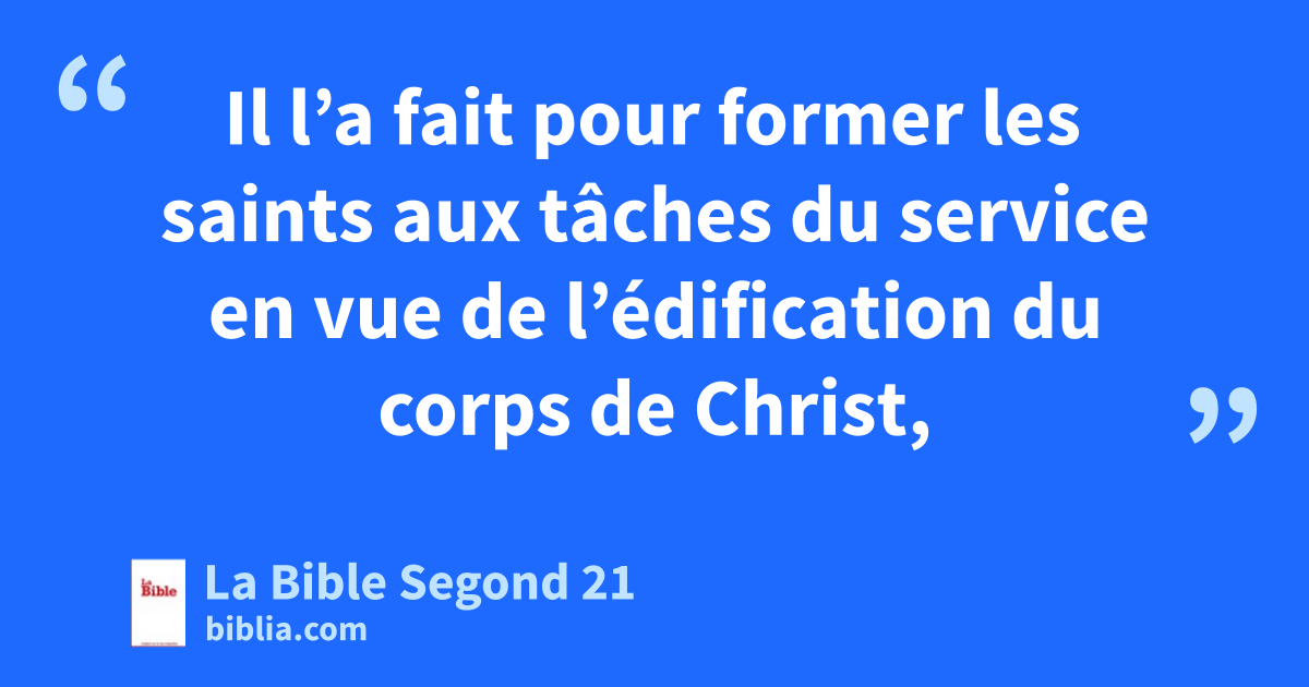 7Cependant, à chacun de nous la grâce a été donnée à la mesure du don de Christ. 8C’est pourquoi il est dit: Il est monté sur les hauteurs, il a emmené des prisonniers et il a fait des dons aux hommes.h 9Or, que signifie: Il est monté, sinon qu’il est aussi [d’abord] descendu dans les régions les plus basses de la terre? 10Celui qui est descendu, c’est celui qui est monté au-dessus de tous les cieux afin de remplir tout l’univers. 11C’est lui qui a donné les uns comme apôtres, les autres comme prophètes, les autres comme évangélistes, les autres comme bergers et enseignants. 12Il l’a fait pour former les saints aux tâches du service en vue de l’édification du corps de Christ, 13jusqu’à ce que nous parvenions tous à l’unité de la foi et de la connaissance du Fils de Dieu, à la maturité de l’adulte, à la mesure de la stature parfaite de Christ. 14Ainsi, nous ne serons plus de petits enfants, ballottés et emportés par tout vent de doctrine, par la ruse des hommes et leur habileté dans les manœuvres d’égarement. 15Mais en disant la vérité dans l’amour, nous grandirons à tout point de vue vers celui qui est la tête, Christ. 16C’est de lui que le corps tout entier, bien coordonné et solidement uni grâce aux articulations dont il est muni, tire sa croissance en fonction de l’activité qui convient à chacune de ses parties et s’édifie lui-même dans l’amour.