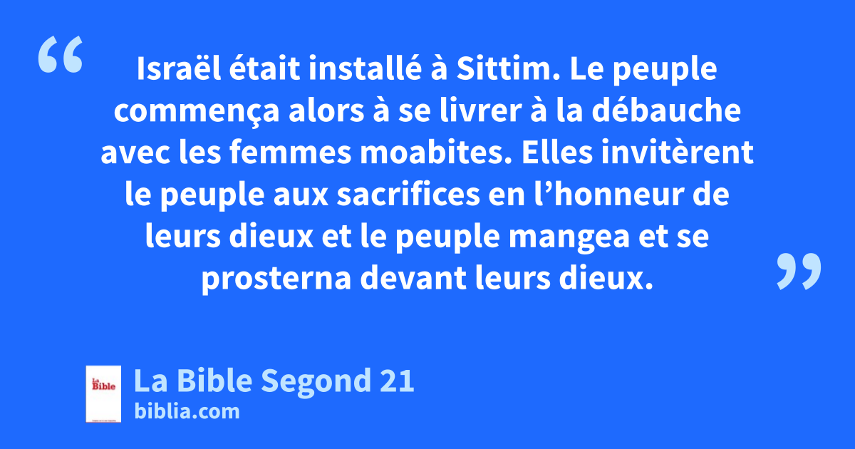 25 Israël était installé à Sittim. Le peuple commença alors à se livrer à la débauche avec les femmes moabites. 2Elles invitèrent le peuple aux sacrifices en l’honneur de leurs dieux et le peuple mangea et se prosterna devant leurs dieux. 3Israël s’attacha au dieu Baal-Peoro et la colère de l’Eternel s’enflamma contre Israël. 4L’Eternel dit à Moïse: «Rassemble tous les chefs du peuple et fais pendre les coupables devant l’Eternel en face du soleil, afin que la colère ardente de l’Eternel se détourne d’Israël.» 5Moïse dit aux juges d’Israël: «Que chacun de vous tue ceux des siens qui se sont attachés à Baal-Peor.»