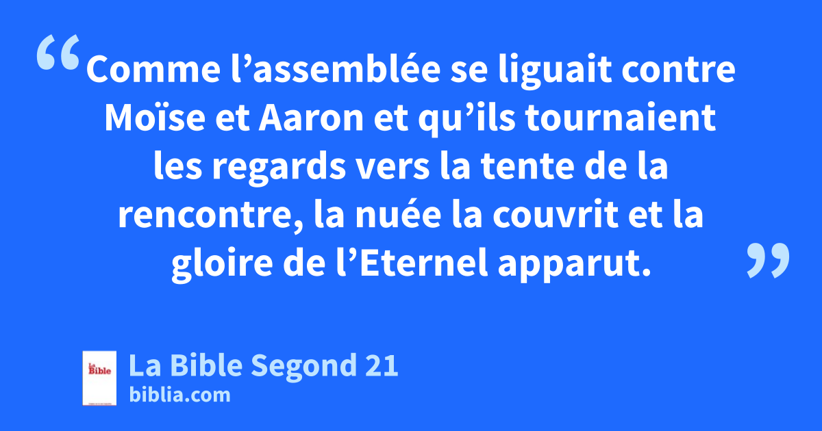 6Dès le lendemain, toute l’assemblée des Israélites murmura contre Moïse et Aaron en disant: «Vous avez fait mourir le peuple de l’Eternel.» 7Comme l’assemblée se liguait contre Moïse et Aaron et qu’ils tournaient les regards vers la tente de la rencontre, la nuée la couvrit et la gloire de l’Eternel apparut. 8Moïse et Aaron arrivèrent devant la tente de la rencontre, 9et l’Eternel dit à Moïse: 10«Retirez-vous de cette assemblée, que je les détruise en un instant.» Ils tombèrent le visage contre terre, 11et Moïse dit à Aaron: «Prends le brûle-parfum, mets-y du feu provenant de l’autel, poses-y du parfum, va vite vers l’assemblée et fais l’expiation pour eux. En effet, la colère de l’Eternel a éclaté, le fléau a commencé.» 12Aaron prit le brûle-parfum, comme Moïse le lui avait dit, et courut au milieu de l’assemblée. Le fléau avait effectivement commencé parmi le peuple. Il offrit le parfum et fit l’expiation pour le peuple. 13Il se plaça entre les morts et les vivants, et le fléau fut arrêté. 14Il y eut 14’700 personnes qui moururent de ce fléau, en plus de celles qui étaient mortes à cause de Koré. 15Aaron retourna auprès de Moïse à l’entrée de la tente de la rencontre. Le fléau était arrêté.