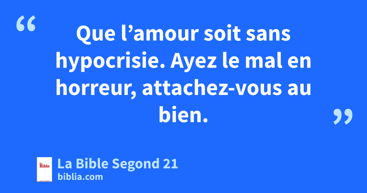9Que l’amour soit sans hypocrisie. Ayez le mal en horreur, attachez-vous au bien. 10Par amour fraternel soyez pleins d’affection les uns pour les autres et rivalisez d’estime réciproque. 11Ayez du zèle, et non de la paresse. Soyez fervents d’esprit et servez le Seigneur. 12Réjouissez-vous dans l’espérance et soyez patients dans la détresse. Persévérez dans la prière. 13Pourvoyez aux besoins des saints et exercez l’hospitalité avec empressement.