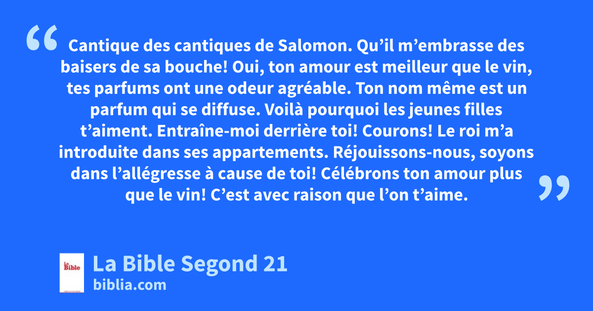 2Qu’il m’embrasse des baisers de sa bouche! Oui, ton amour est meilleur que le vin, 3tes parfums ont une odeur agréable. Ton nom même est un parfum qui se diffuse. Voilà pourquoi les jeunes filles t’aiment. 4Entraîne-moi derrière toi! Courons!