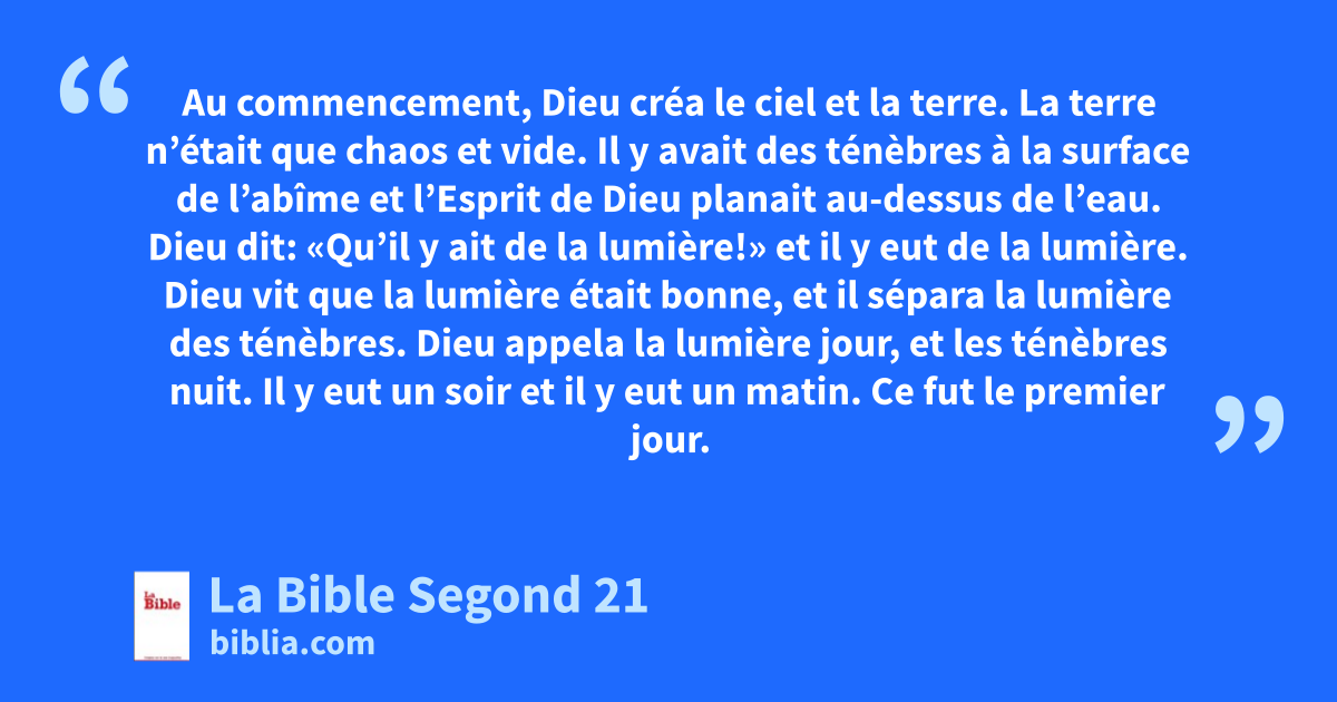 1 Au commencement, Dieu créa le ciel et la terre. 2La terre n’était que chaos et vide. Il y avait des ténèbres à la surface de l’abîme et l’Esprit de Dieu planait au-dessus de l’eau.