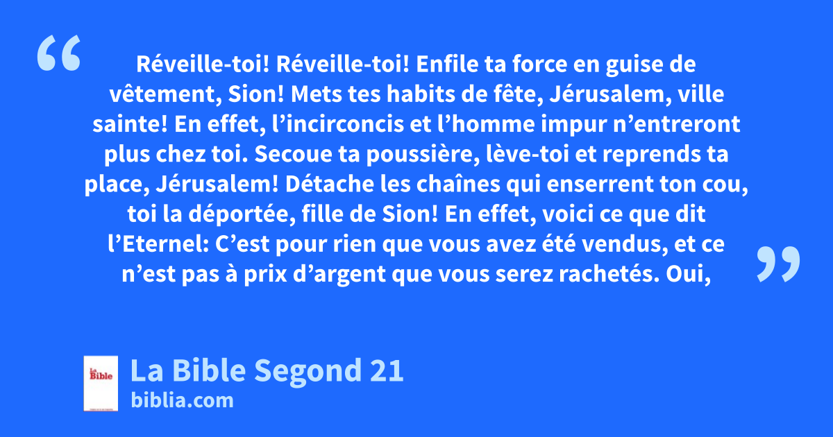 52 Réveille-toi! Réveille-toi! Enfile ta force en guise de vêtement, Sion! Mets tes habits de fête, Jérusalem, ville sainte! En effet, l’incirconcis et l’homme impur n’entreront plus chez toi. 2Secoue ta poussière, lève-toi et reprends ta place, Jérusalem! Détache les chaînes qui enserrent ton cou, toi la déportée, fille de Sion!