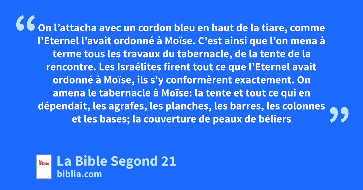 42Les Israélites firent tous ces travaux en se conformant à tous les ordres que l’Eternel avait donnés à Moïse. 43Moïse examina tout le travail et vit qu’ils l’avaient fait comme l’Eternel l’avait ordonné, ils l’avaient fait exactement ainsi. Alors Moïse les bénit.