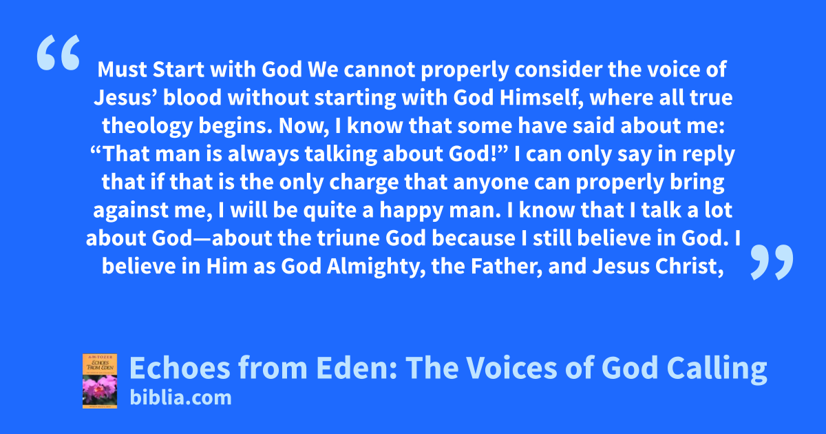 Must Start with God We cannot properly consider the voice of Jesus’ blood without starting with God Himself, where all true theology begins. Now, I know that some have said about me: “That man is always talking about God!” I can only say in reply that if that is the only charge that anyone can properly bring against me, I will be quite a happy man. I know that I talk a lot about God—about the triune God because I still believe in God. I believe in Him as God Almighty, the Father, and Jesus Christ,
