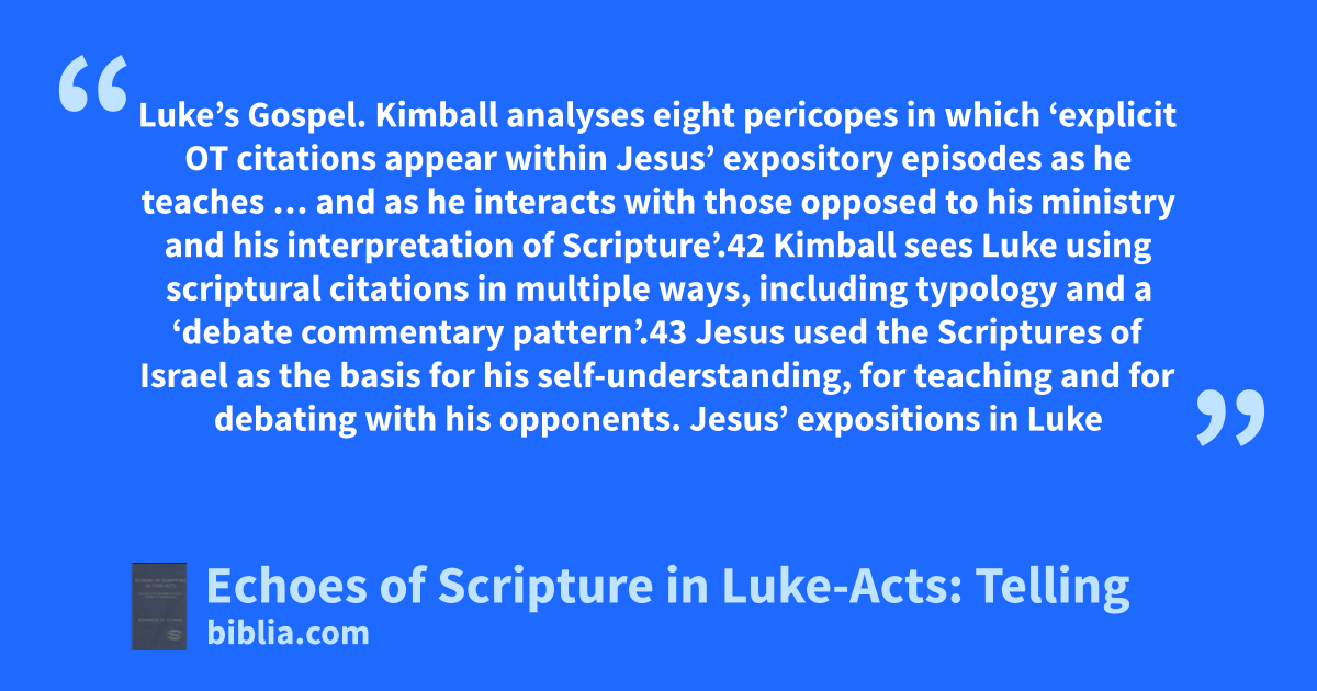 Luke’s Gospel. Kimball analyses eight pericopes in which ‘explicit OT citations appear within Jesus’ expository episodes as he teaches … and as he interacts with those opposed to his ministry and his interpretation of Scripture’.42 Kimball sees Luke using scriptural citations in multiple ways, including typology and a ‘debate commentary pattern’.43 Jesus used the Scriptures of Israel as the basis for his self-understanding, for teaching and for debating with his opponents. Jesus’ expositions in Luke