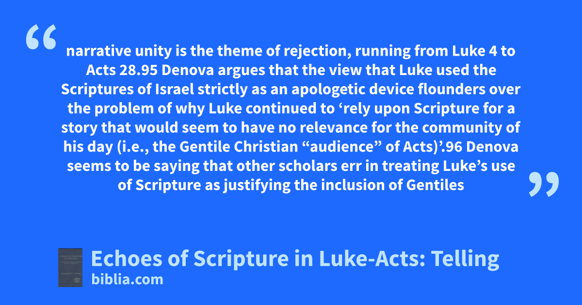 narrative unity is the theme of rejection, running from Luke 4 to Acts 28.95 Denova argues that the view that Luke used the Scriptures of Israel strictly as an apologetic device flounders over the problem of why Luke continued to ‘rely upon Scripture for a story that would seem to have no relevance for the community of his day (i.e., the Gentile Christian “audience” of Acts)’.96 Denova seems to be saying that other scholars err in treating Luke’s use of Scripture as justifying the inclusion of Gentiles