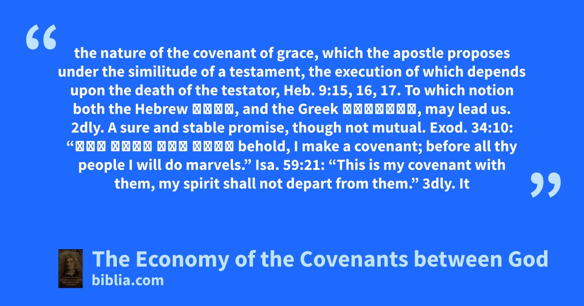 the nature of the covenant of grace, which the apostle proposes under the similitude of a testament, the execution of which depends upon the death of the testator, Heb. 9:15, 16, 17. To which notion both the Hebrew ברית, and the Greek διαθὴκη, may lead us. 2dly. A sure and stable promise, though not mutual. Exod. 34:10: “הנה אנכי ברת ברית behold, I make a covenant; before all thy people I will do marvels.” Isa. 59:21: “This is my covenant with them, my spirit shall not depart from them.” 3dly. It