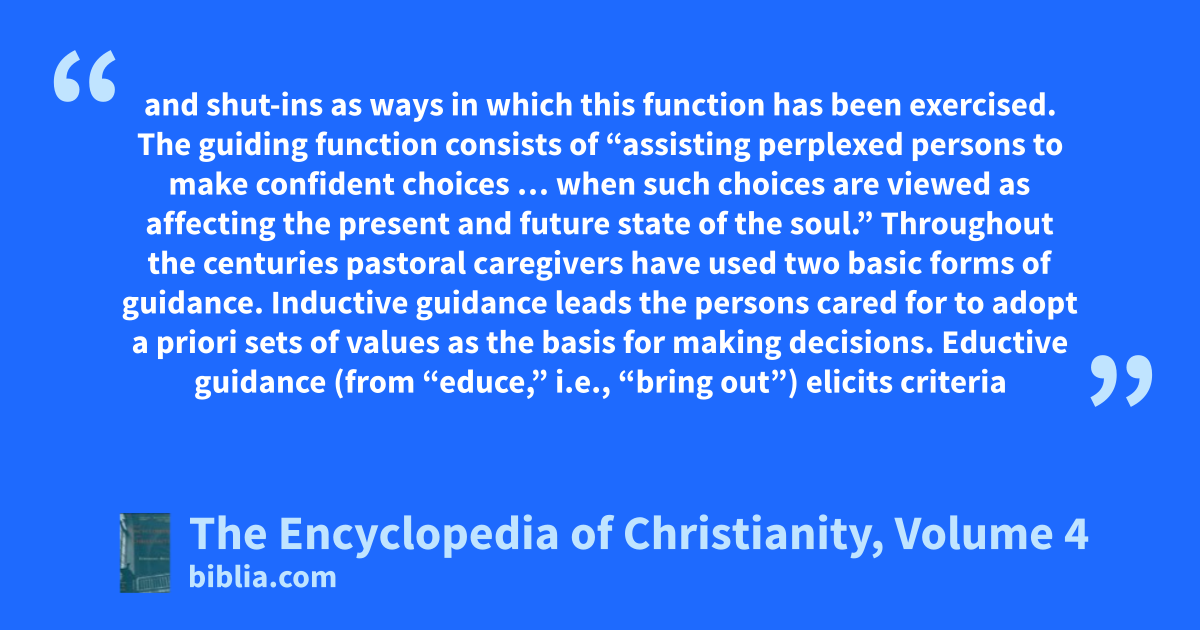 and shut-ins as ways in which this function has been exercised. The guiding function consists of “assisting perplexed persons to make confident choices … when such choices are viewed as affecting the present and future state of the soul.” Throughout the centuries pastoral caregivers have used two basic forms of guidance. Inductive guidance leads the persons cared for to adopt a priori sets of values as the basis for making decisions. Eductive guidance (from “educe,” i.e., “bring out”) elicits criteria